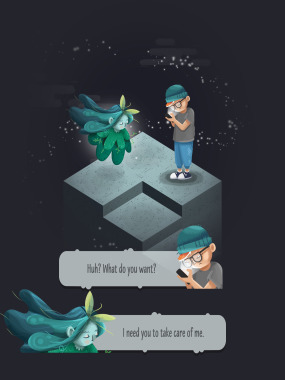 In "Nature Matters" you take on a role of a little plant spirit. Without protection, surrounded by a city that grows up from everywhere, one day she realizes